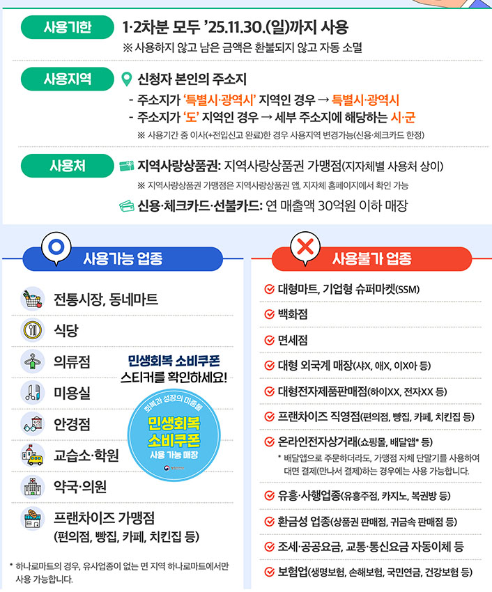 "대형마트, 기업형 슈퍼마켓, 백화점 및 면세점, 온라인 쇼핑몰·배달앱, 유흥·사행업종, 환금성 업종 등은 사용이 제한되는 업종" 사용할 수 없습니다.