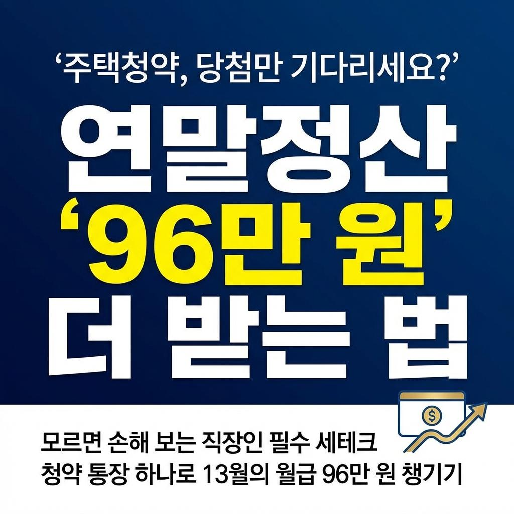 주택청약 소득공제 혜택을 아직도 모르고 넘어가시는 분들이 의외로 많습니다. 바쁜 직장인들을 위해 결론부터 확실하게 말씀드리겠습니다. 매월 꾸준히 청약 통장에 일정 금액을 납입하고 연말정산 기간 전 '무주택 확인서'만 제출하면, 다가오는 연말정산에서 연간 최대 96만 원의 소득공제를 받아 13월의 월급을 두둑하게 챙길 수 있습니다.