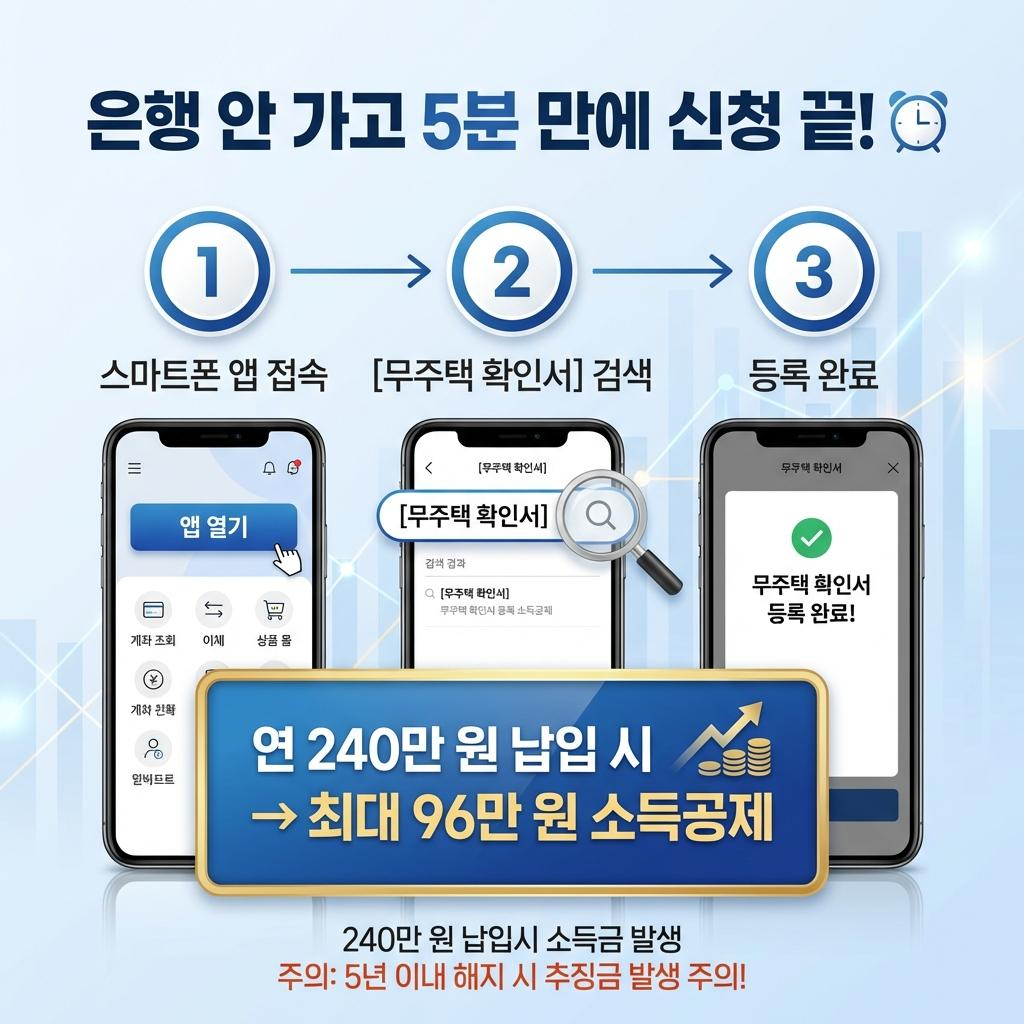자격 요건을 충족하고 납입도 꾸준히 하셨나요? 그렇다면 이제 국세청과 은행에 내가 '무주택 세대주'임을 증명하는 절차만 거치면 됩니다. 과거에는 반차를 내고 은행 창구에 직접 방문해야 했지만, 이제는 스마트폰만 있으면 5분 만에 해결할 수 있습니다.
