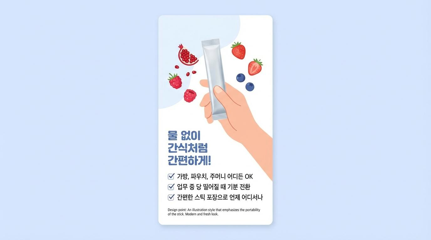 휴대용 콜라겐 젤리의 가장 큰 장점은 물 없이도 간식처럼 섭취할 수 있다는 점입니다. 가방이나 파우치, 심지어 코트 주머니에도 쏙 들어가는 슬림한 스틱 포장 덕분에 출근길 지하철에서나 회의 전 대기 시간에도 부담 없이 꺼내 먹을 수 있습니다. 바쁜 업무 중에 당이 떨어질 때 상큼한 과일 맛의 젤리 한 포를 섭취하면, 기분 전환은 물론 피부 탄력까지 챙기는 일석이조의 효과를 누릴 수 있습니다.
