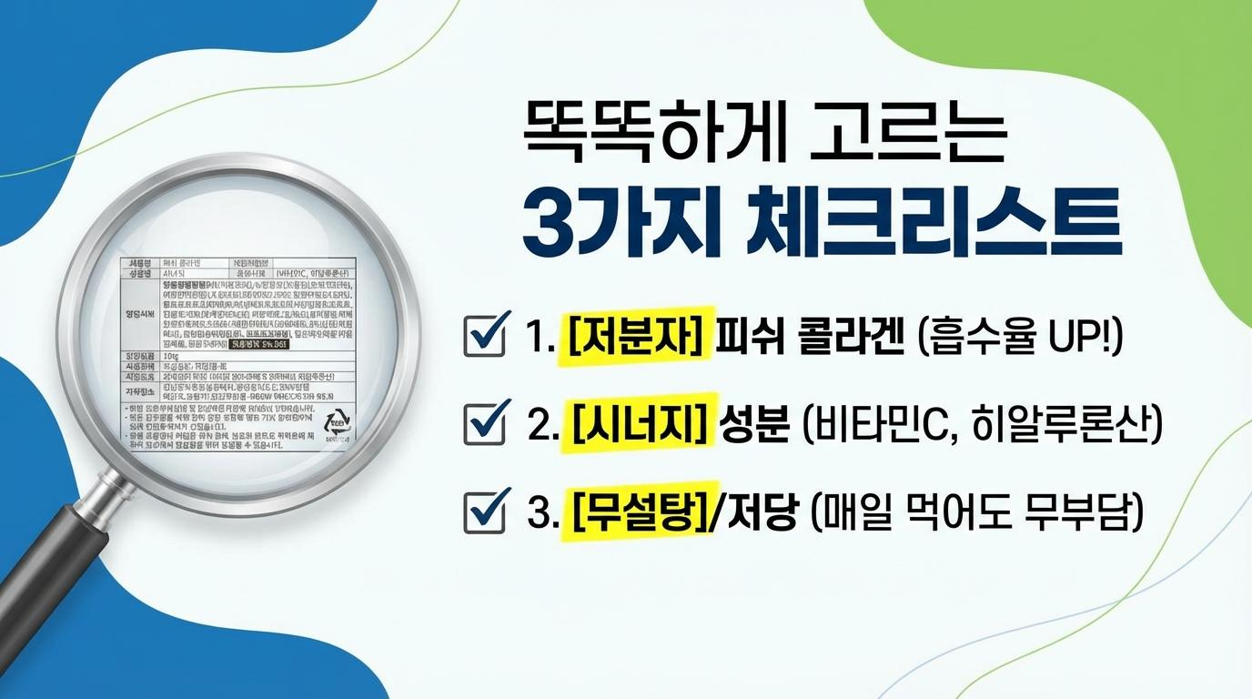 먼저, 분자 크기가 작은 '저분자 피쉬 콜라겐'인지 확인하세요. 콜라겐은 분자량이 작을수록(DA, 달톤 수치가 낮을수록) 체내 흡수율이 높아집니다. 또한, 콜라겐의 합성을 돕는 비타민 C나 수분을 끌어당기는 히알루론산, 엘라스틴 같은 시너지 성분이 함께 함유된 제품을 선택하는 것이 더욱 효율적입니다.