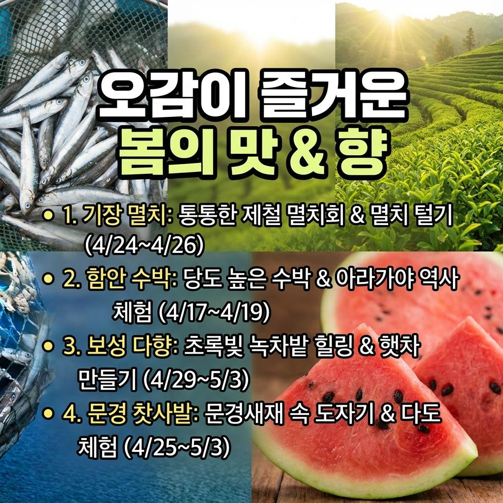 - 기장 멸치축제 (4/24~4/26 예정): 봄 멸치는 '봄의 보약'이라 불릴 만큼 살이 통통합니다. 대변항에서 펼쳐지는 역동적인 멸치 털기 퍼포먼스를 구경하고 싱싱한 멸치회와 구이를 맛보세요.